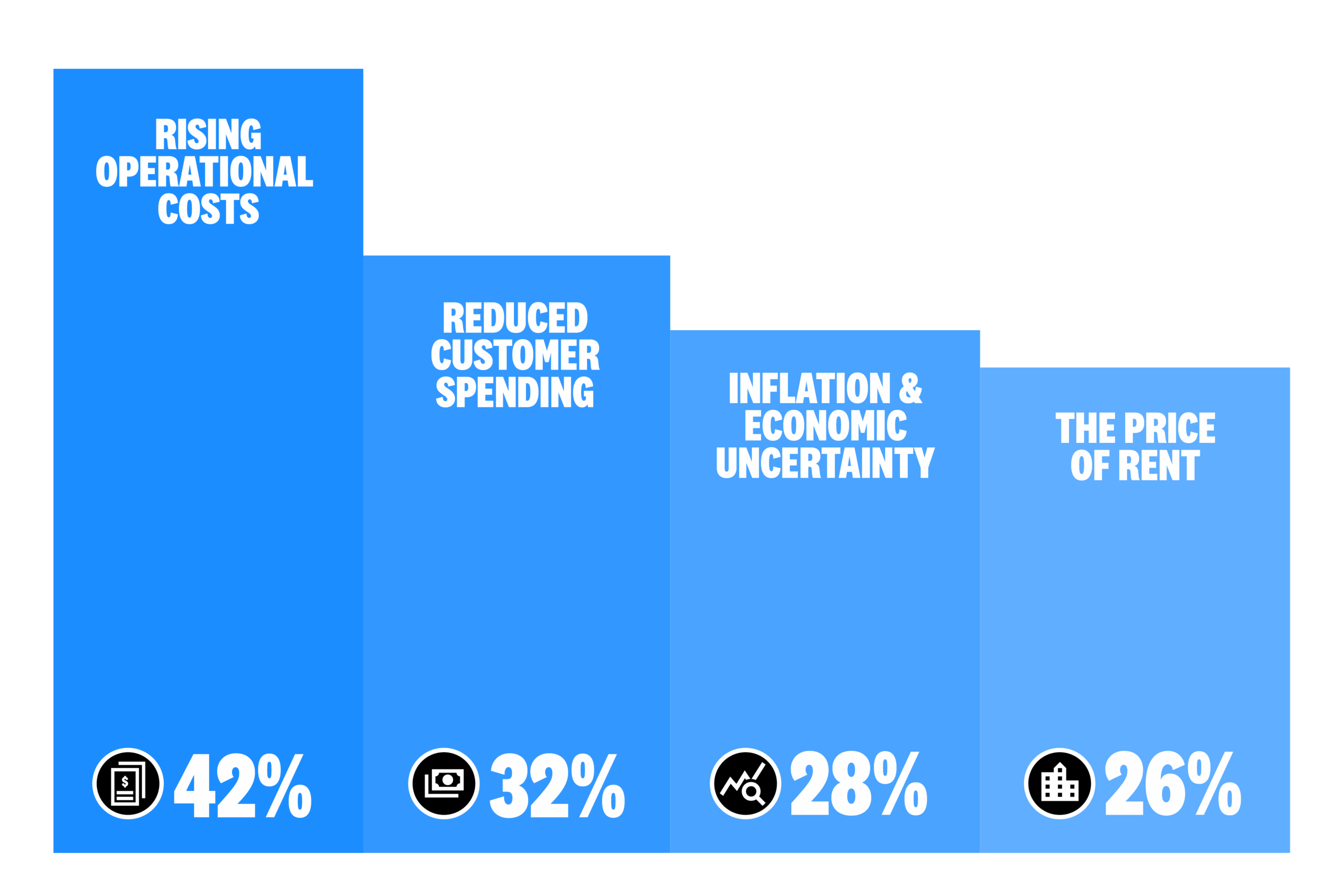 When asked what they are concerned about, more than four in ten owners (42%) say increasing costs are top of mind, closely followed by reduced customer spending (32%). Rent pressures also continue to weigh on one in four businesses.