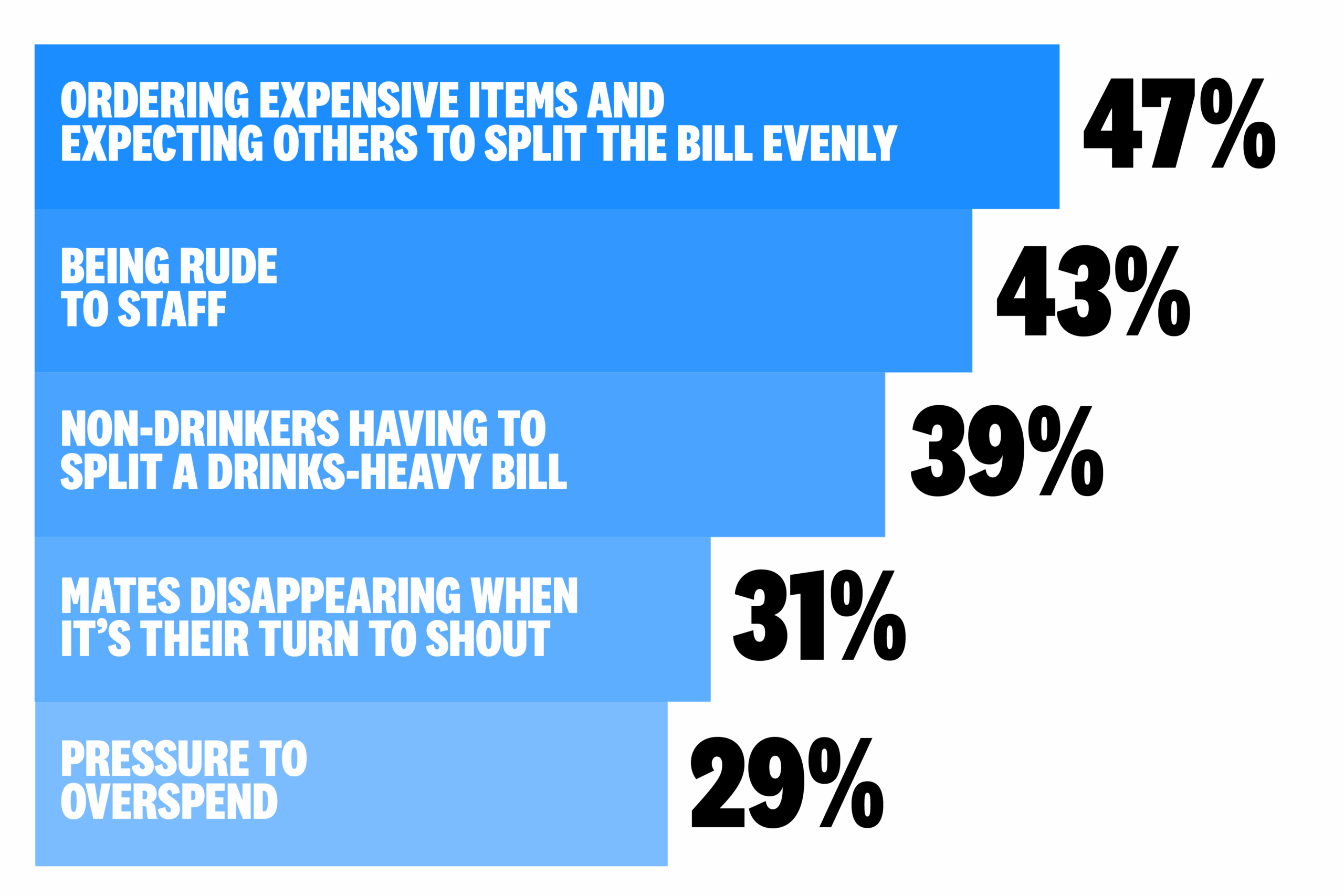 Half of Australians (50%) now prefer to pay only for their own order, rather than splitting the bill evenly (17%) or taking turns shouting (9%).