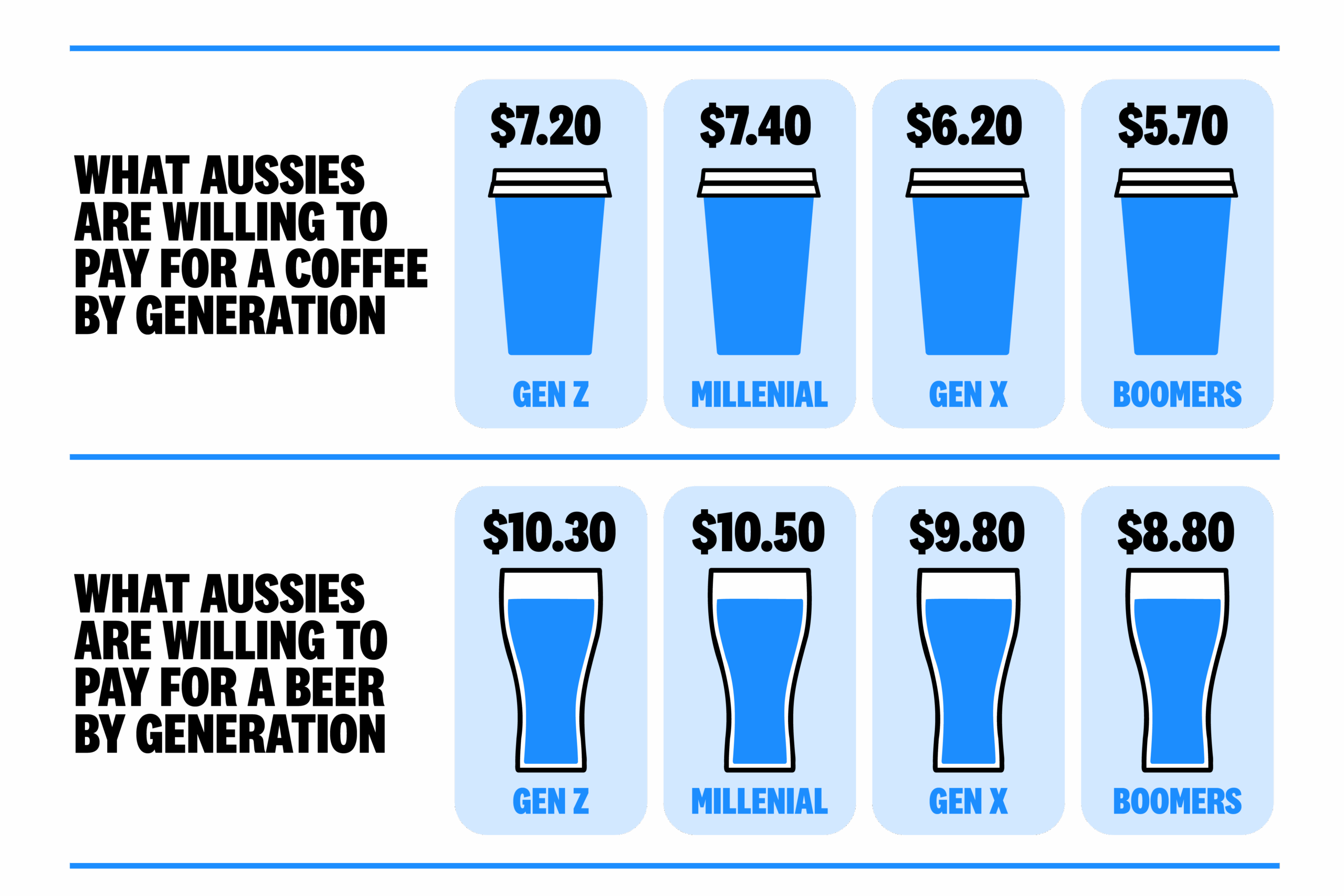 However, willingness to pay is already lagging behind expectations. The average maximum price Australians say they’re willing to pay for a coffee is $6.60. For a beer, the average ceiling is $9.80, meaning expected 2026 prices exceed what many Australians say they are willing to pay.