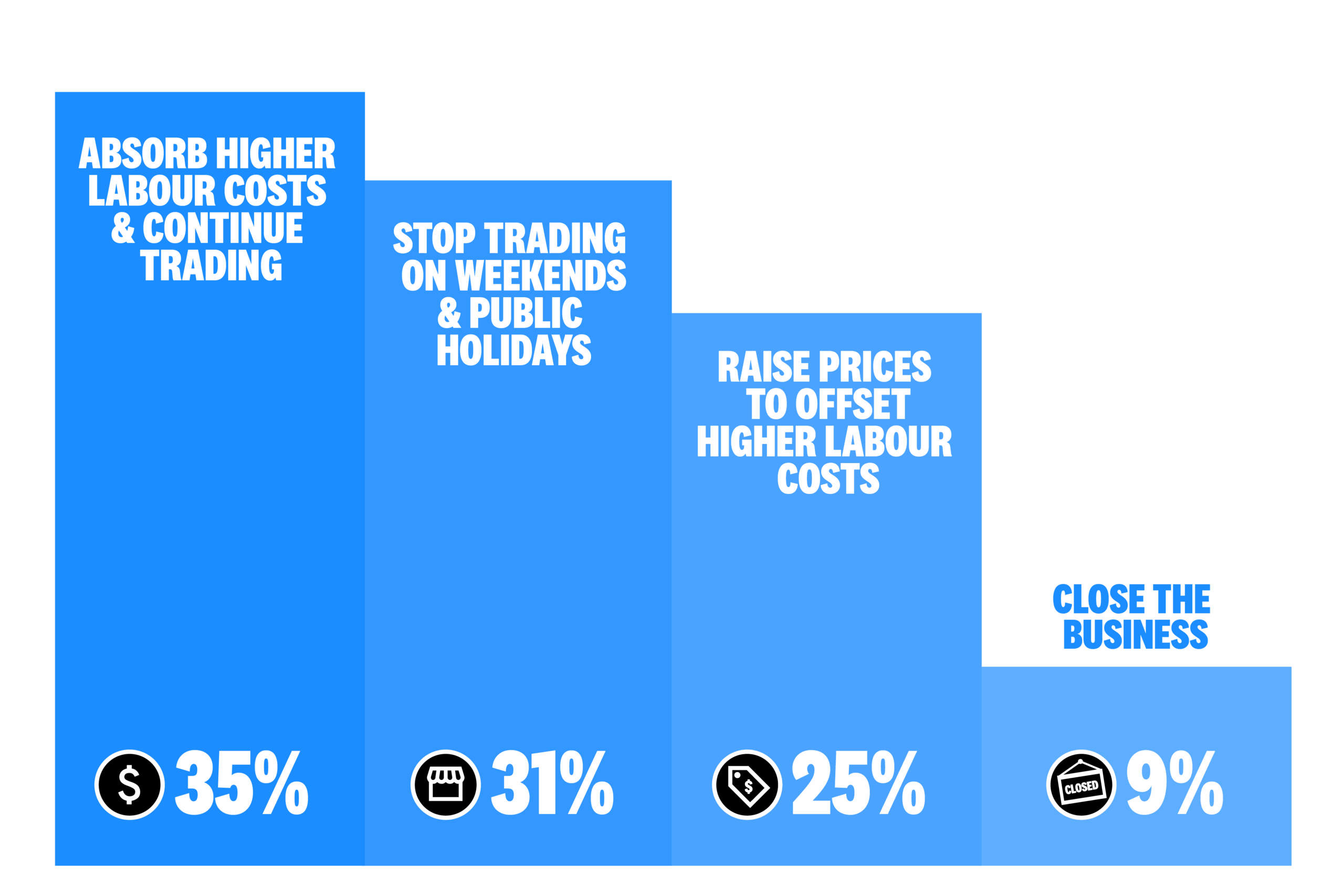 If public holiday pricing was removed, nearly one in three (31%) businesses say they would stop trading on weekends or public holidays, while almost one in ten (9%) say they would need to close entirely.