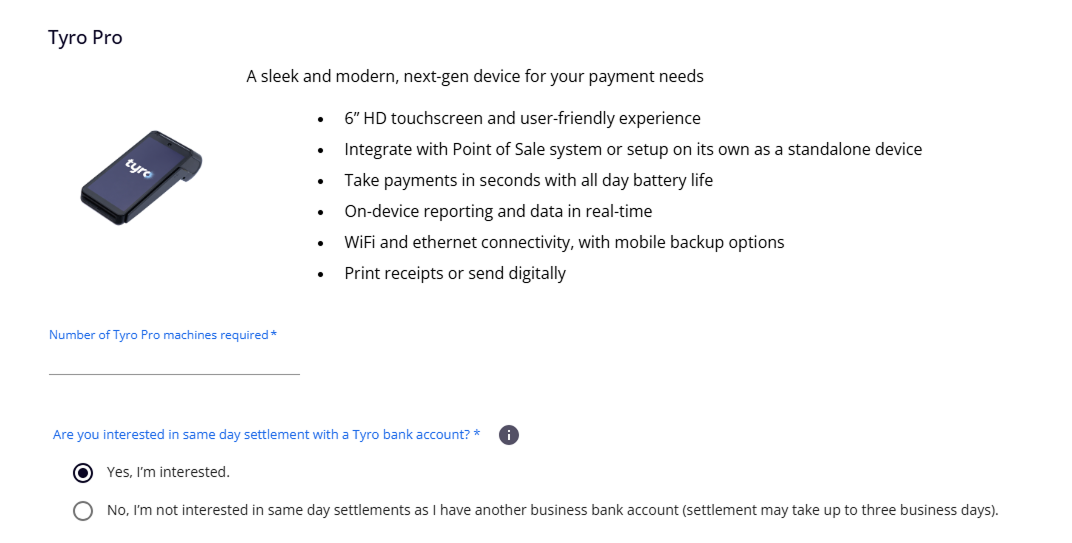On this page, you’ll be asked to confirm and select the number of EFTPOS devices or services your business needs. In this example, we’re showing the Tyro Pro EFTPOS terminal and requesting one device. We also offer a Tyro Transaction Account for same-day settlements. If you want to add this to your application, just leave the option selected.